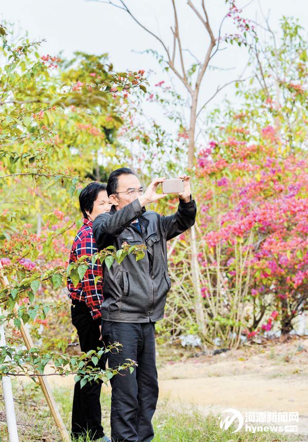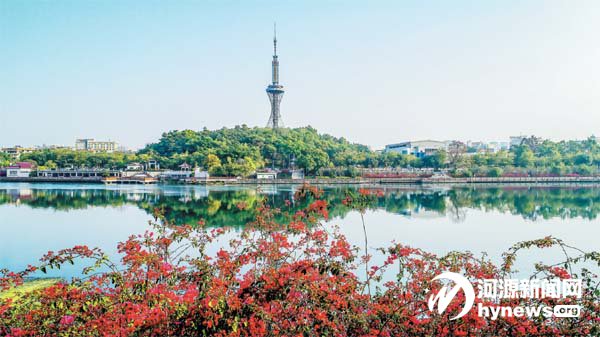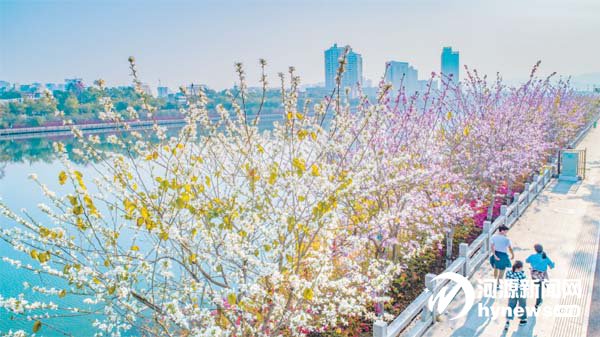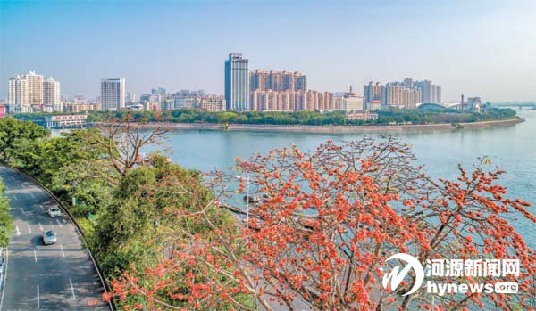 在市區新豐江(市政府河段)兩岸,紫 紅色的紫荊花爭先綻放,與簕杜鵑相互映 襯,倒影在江上,給每一位在江邊散步的市 民帶來愉悅的心情。而沿江路的幾株木棉 花,隨著近日來的氣溫回升,也開始綻放, 成為了市區一道靚麗的風景線。除此之 外,市區還有櫻花、桃花等等。