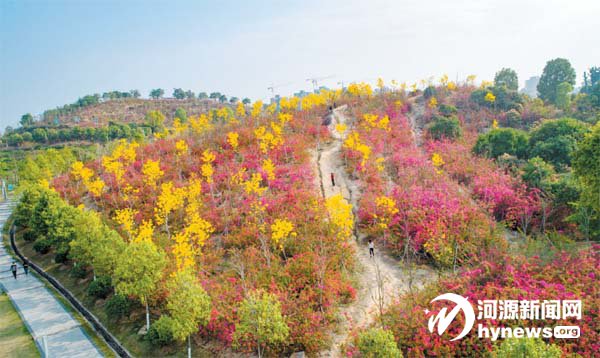 連日來,本報記者走訪了市區多個路段及 部分公園發現,在市區客家文化公園的小山坡 上,這里的黃花風鈴木正開著鮮艷的花朵,風一 吹,漏斗狀的花瓣隨風飄落,散落一地,像是給 公園鋪上了金黃的地毯。在市花簕杜鵑的襯 托下,花團錦簇的黃花風鈴木顯得更加特別。