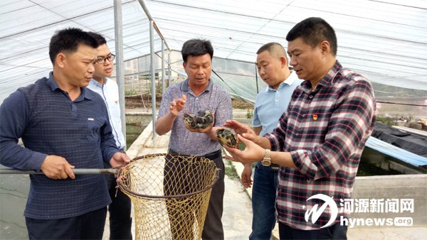 駐村工作隊和璜光村村干部在查看中華龜長勢情況。