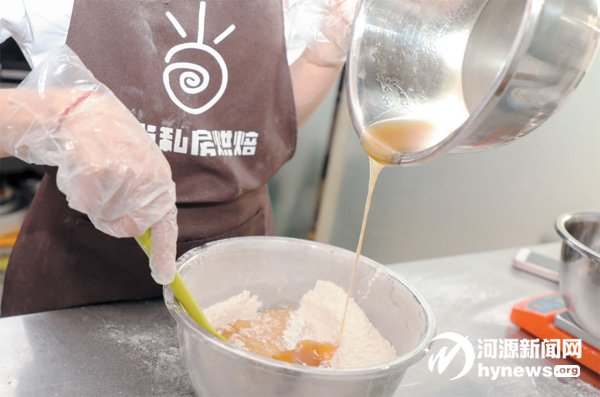 在攪拌轉(zhuǎn)化糖漿、枧水和花生油的時(shí)候,張惠萍認(rèn)真盯著電子秤的顯示屏,確保各種食材分量都精準(zhǔn)到位。她說(shuō),月餅口感好不好,餅皮形狀好不好,關(guān)鍵之一就是轉(zhuǎn)化糖漿、枧水的比例是否精確,多一分少一分都會(huì)影響成品。