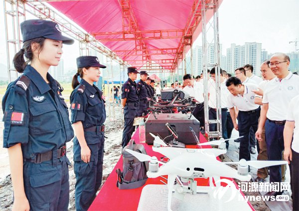 大會會場還設置了展示臺,向市民群眾展示武器警械、防護裝備,包括破門四件套、防彈衣、鋼盔、警用弓弩、警用無人機以及各式槍支等。