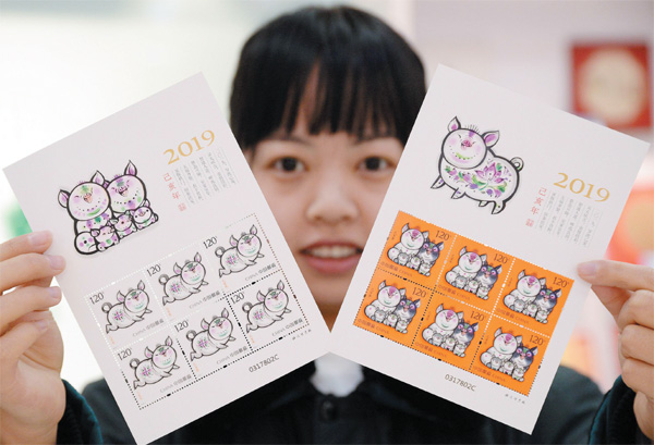 前日,中國郵政集團公司邯鄲市分公司工作人員展示《己亥年》郵票。當日,中國郵政發行《己亥年》特種郵票1套2枚,圖案分別是“肥豬旺福”和“五福齊聚”,全套郵票面值2.40元。另發行小本票1本,售價12元。