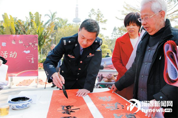 在市區茶山公園,河源公安文聯書法家、愛好者擺出十張書畫桌,帶來300多副春聯紙,現場揮毫為群眾書寫春聯。據悉,該活動已經走進革命老區、扶貧村、街道、公園等地,截至目前已經舉辦了6場活動,行程500多公里,書寫春聯2000多副,福貼2000多張,拍攝照片1000多張。是歷年來規模最大、場次最多、效果最好的一次文化惠民系列活動。