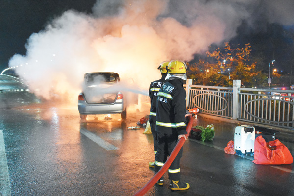 近日,東源大橋往泥坑方向一輛行駛中的小車著火自燃,東源消防中隊接到指令后立即出動2輛消防車、9名指戰員趕往現場處置。