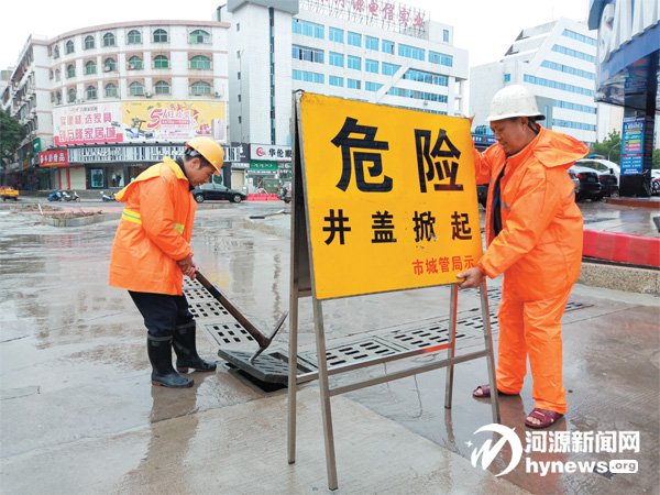 華怡路口,市政搶險人員上街打開雨水蓋,清理路面積水。