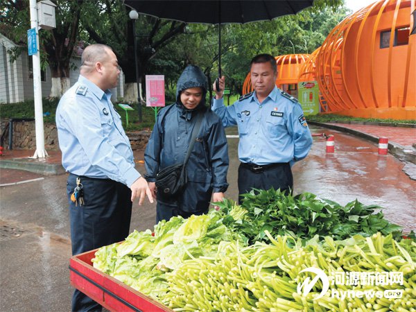 城管執法支隊隊員在雨中巡查,勸離流動攤販。