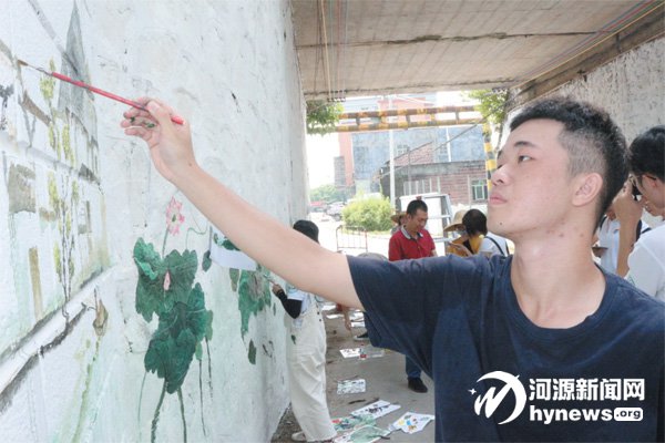 19日,源城區(qū)源南鎮(zhèn)雙下村主村道鐵路橋橋洞下,14名中山大學(xué)的師生正頂著烈日對橋洞進(jìn)行墻繪,筆下的荷葉千姿百態(tài),栩栩如生,受到了當(dāng)?shù)卮迕竦膰K嘖稱贊。