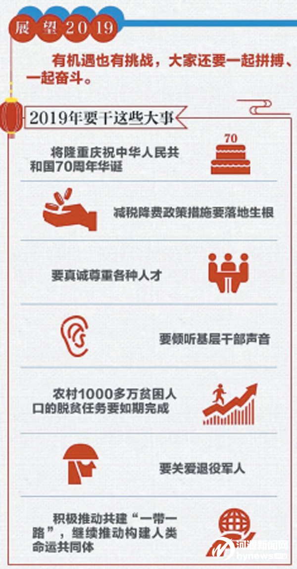 “我們都在努力奔跑,我們都是追夢人。”2019年到來之際,國家主席習近平發表新年賀詞。這是回顧過去一年奮斗歷程和輝煌成就的豪邁宣言,也是新的一年風雨兼程再出發的奮斗序曲。賀詞飽含對廣大人民的深情,彰顯對中國發展的堅定信心,體現對人類前途命運的關懷與擔當,激蕩起億萬人民奮進新時代、共筑中國夢的磅礴力量。