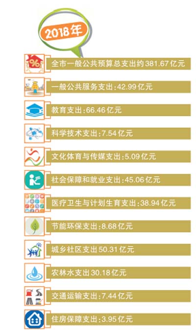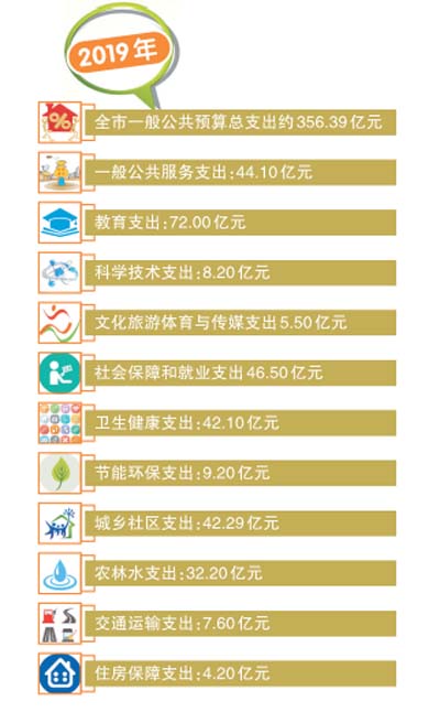 2019年,我市預(yù)算支出仍將堅(jiān)持以民生為主。記者從《報(bào)告》中看到,2019年全市的公共財(cái)政預(yù)算支出中,教育、社會(huì)保障與就業(yè)、一般公共服務(wù)、城鄉(xiāng)社區(qū)、衛(wèi)生健康、農(nóng)林水等仍是支出重點(diǎn)。其中,2019年教育預(yù)算支出72億元,社會(huì)保障與就業(yè)預(yù)算支出46.50億元,一般公共服務(wù)預(yù)算支出44.10億元,成為2019年預(yù)算支出的前三名。