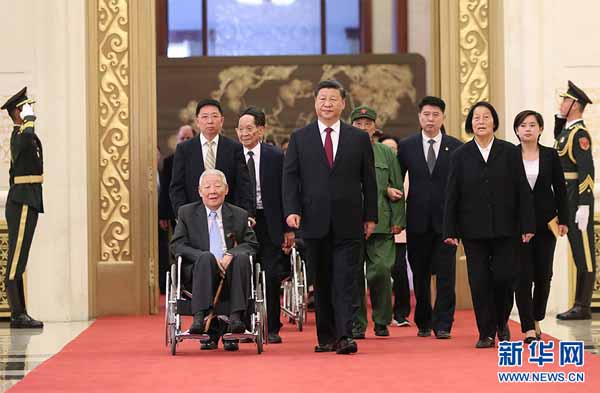 9月29日,中華人民共和國國家勛章和國家榮譽稱號頒授儀式在北京人民大會堂金色大廳隆重舉行。中共中央總書記、國家主席、中央軍委主席習近平同國家勛章和國家榮譽稱號獲得者一同步入會場。 新華社記者 丁海濤 攝