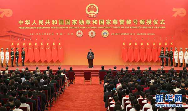 9月29日,中華人民共和國國家勛章和國家榮譽稱號頒授儀式在北京人民大會堂金色大廳隆重舉行。中共中央總書記、國家主席、中央軍委主席習近平向國家勛章和國家榮譽稱號獲得者頒授勛章獎章并發表重要講話。 新華社記者 黃敬文 攝