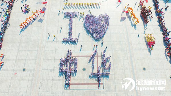 龍川縣全民健身日啟動儀式上,活動現(xiàn)場排出“我愛中華”字樣。(航拍圖)