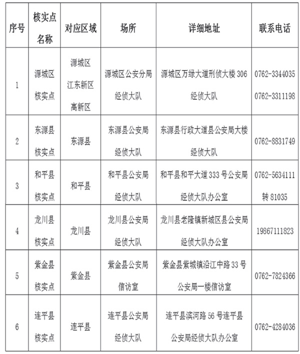 為有效開展信息核實登記工作,方便集資參與人就近參加信息核實登記,河源市在各縣(區)已設置了6個核實點(詳見附件1)。請未參加信息核實登記的集資參與人,及時攜帶相關材料至戶籍所在地或者經常居住地對應的核實點就近參加核實登記。