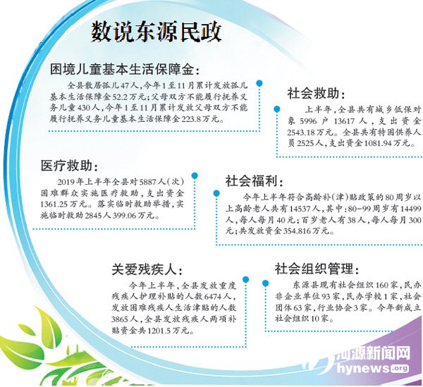 “民政部門聯系民生最緊密、服務群眾最直接,我們將在基本民生保障上繼續下功夫,‘兜牢’基層民生底線。”東源縣民政局相關負責人表示,今年以來,東源縣民政局認真落實國家和省有關醫療救助政策規定,全面開展重特大疾病醫療救助,醫療救助政策得到有效落實。2019年上半年,全縣對5887人(次)困難群眾實施醫療救助,支出資金1361.25萬元;落實臨時救助舉措,2019年上半年實施臨時救助2845人399.06萬元。