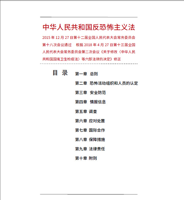第四條 國家將反恐怖主義納入國家安全戰略,綜合施策,標本兼治,加強反恐怖主義的能力建設,運用政治、經濟、法律、文化、教育、外交、軍事等手段,開展反恐怖主義工作。