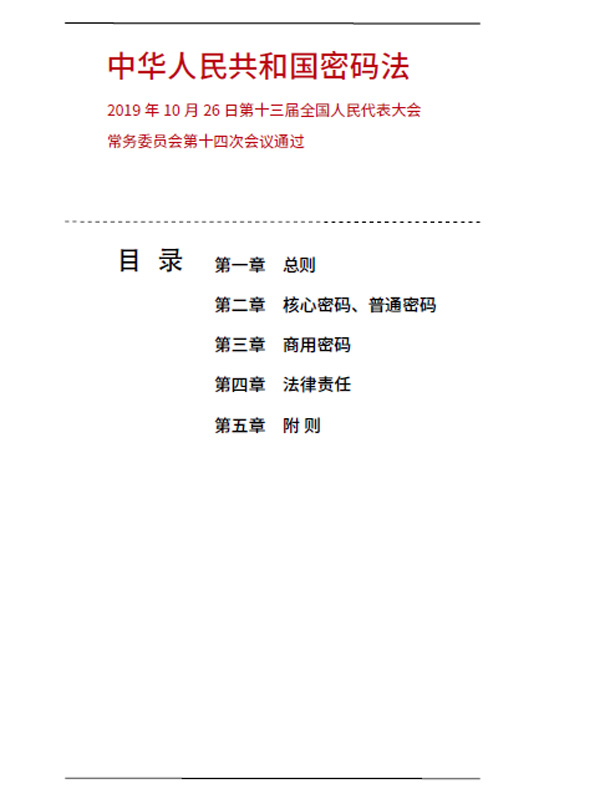 第一條 為了規(guī)范密碼應(yīng)用和管理,促進(jìn)密碼事業(yè)發(fā)展,保障網(wǎng)絡(luò)與信息安全,維護(hù)國(guó)家安全和社會(huì)公共利益,保護(hù)公民、法人和其他組織的合法權(quán)益,制定本法。