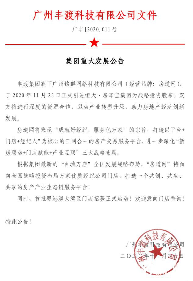 據悉,房道網在11月23日引進了恒大·房車寶集團戰略投資入股。12月1日,宣布“百城萬店”戰略計劃正式啟動。