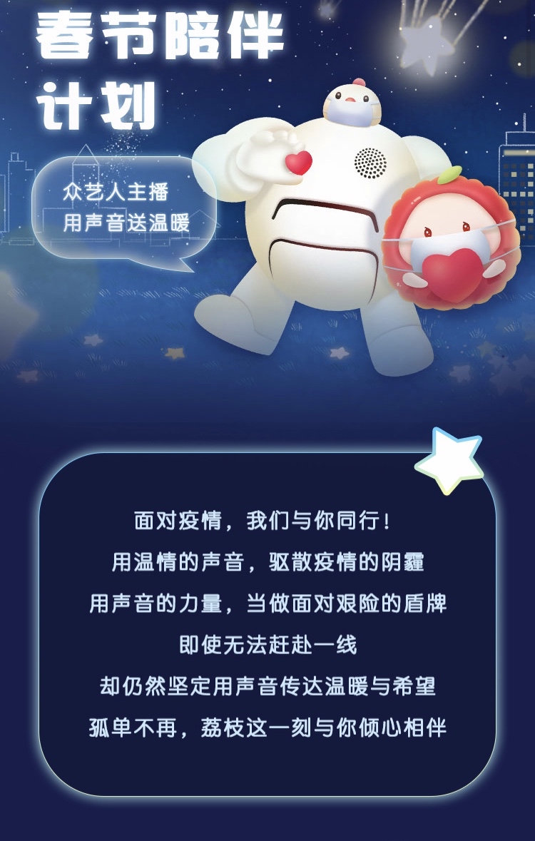 羊城派記者從音頻平臺荔枝了解到,荔枝在近日推出了“春節陪伴計劃”,組織一批藝人、主播和專家,以聊天、唱歌、直播課等方式,為宅在家里的全國人民帶來陪伴和撫慰,緩解疫情帶來的焦慮。