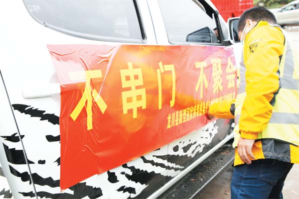 自駕越野車上插上隊旗、裝上喇叭器、調試音量、張貼標語、列隊前行……當天上午9時左右,20多名身著“龍川汽摩應急救援”字樣衣服、戴著口罩的志愿者,在為車載廣播公益宣傳工作做準備。之后,貼著醒目紅色標語的車隊兵分數路,從龍川縣城沿江路出發,一路上播放著疫情防控內容的山歌以及快板等。