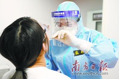 廣州白云國際機(jī)場負(fù)壓排查室內(nèi),工作人員對入境發(fā)熱旅客采集咽拭子。廣州海關(guān)供圖