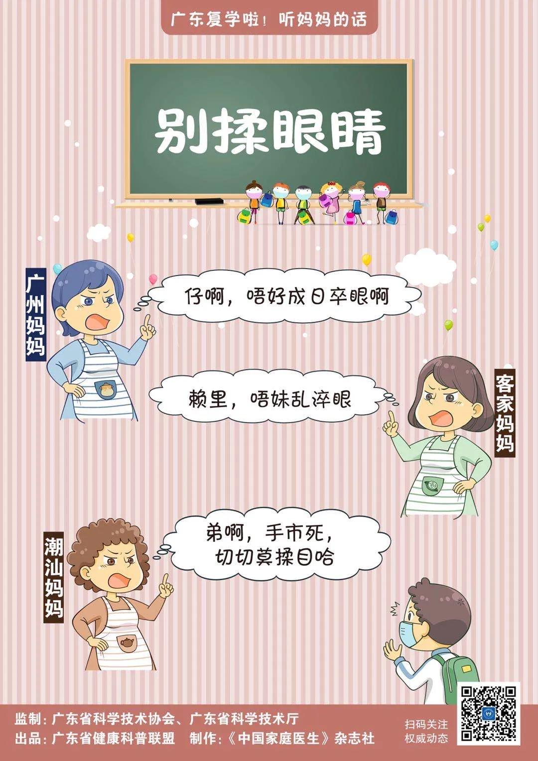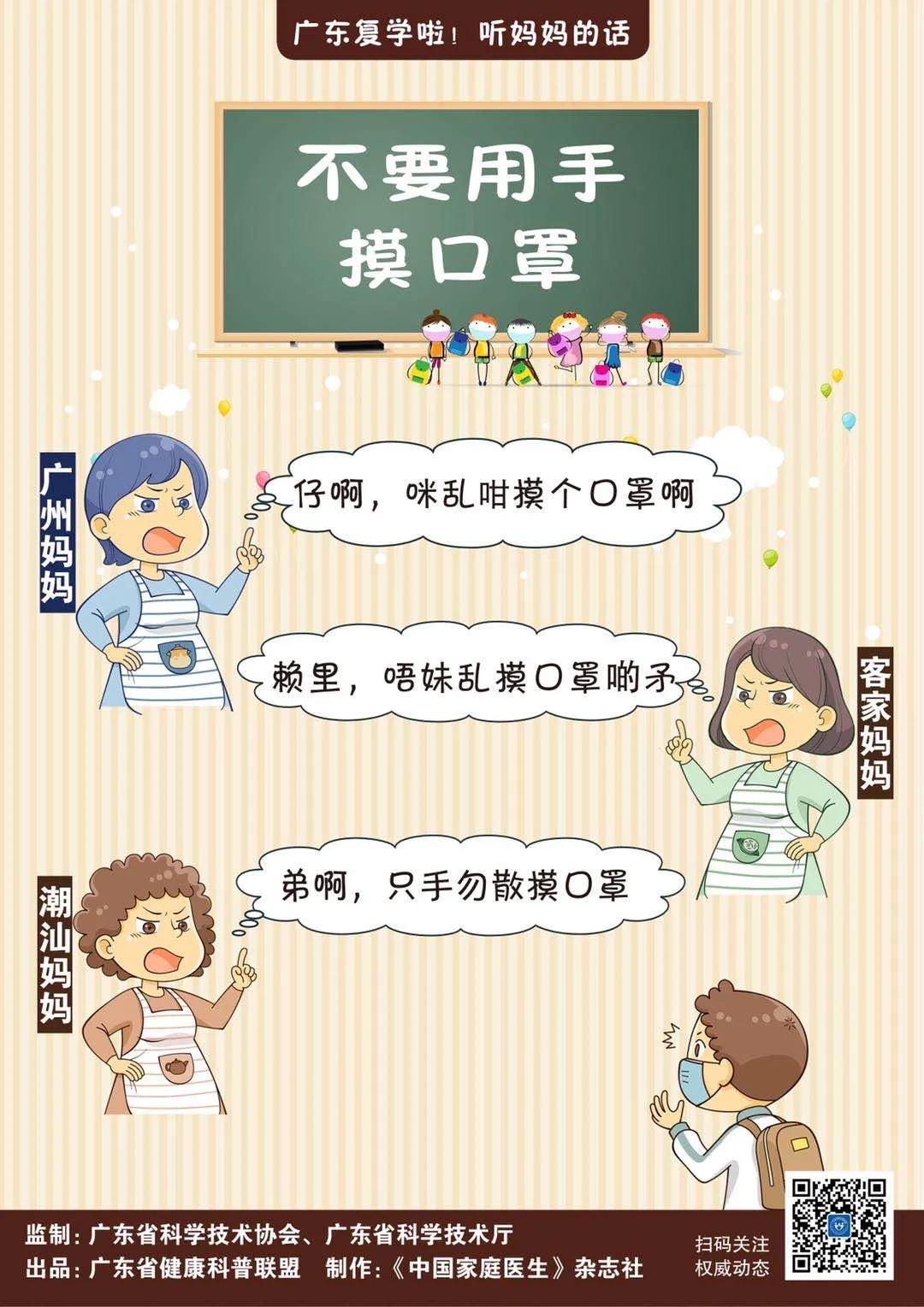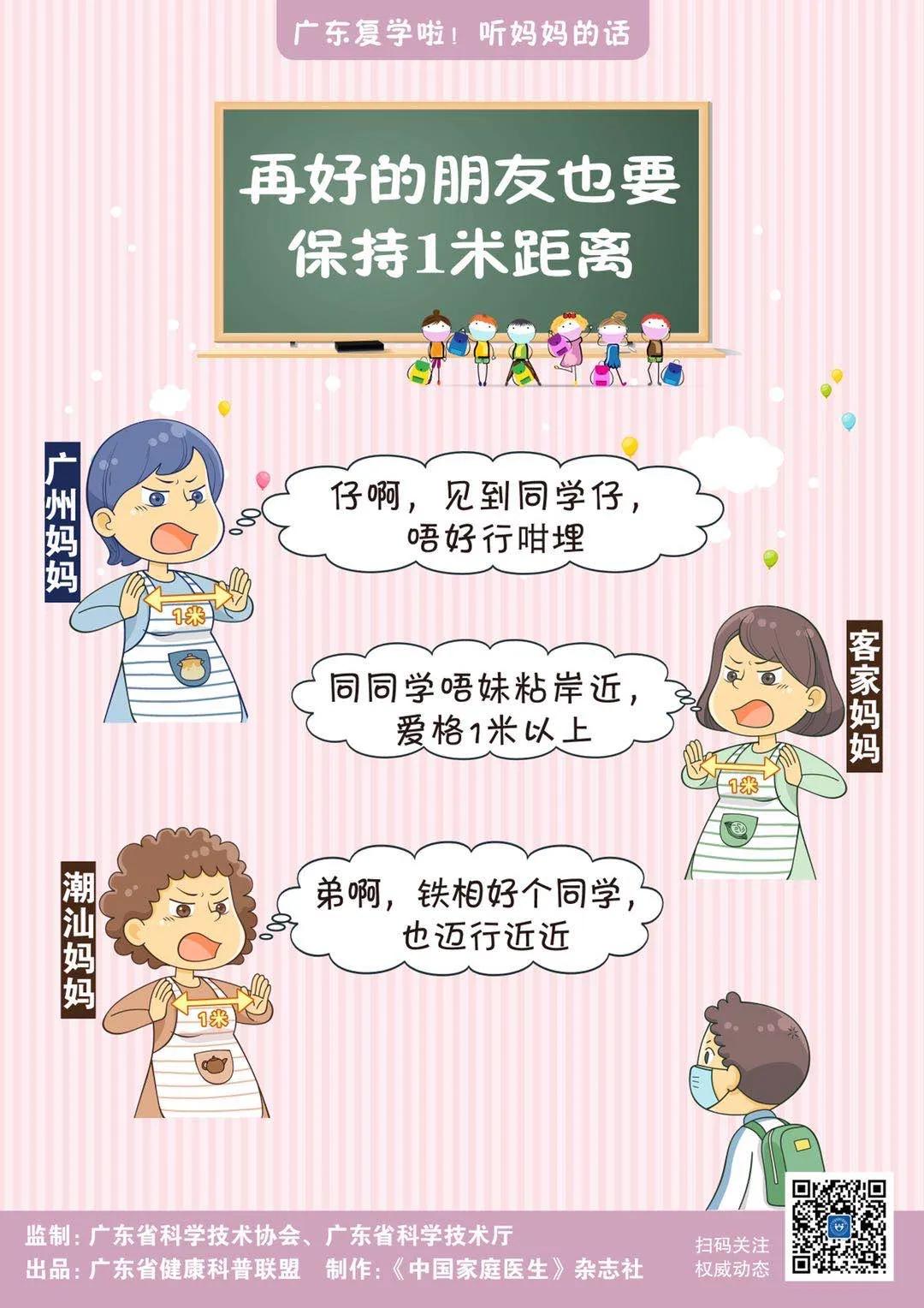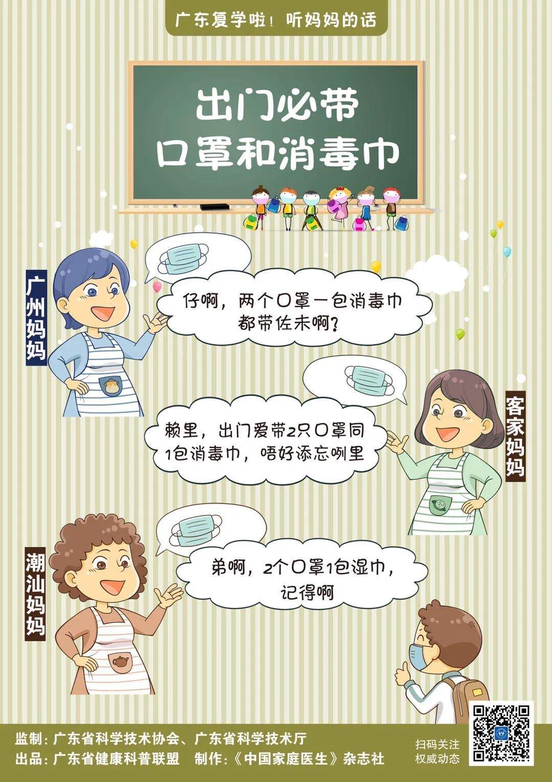 由廣東省科學(xué)技術(shù)協(xié)會、廣東省科學(xué)技術(shù)廳監(jiān)制,廣東省健康科普聯(lián)盟出品,聯(lián)盟成員單位《中國家庭醫(yī)生》雜志社制作的科學(xué)防控應(yīng)急科普宣傳掛畫——復(fù)學(xué)篇,為你重現(xiàn)廣州媽媽、客家媽媽和潮汕媽媽的“操心碎碎念”,復(fù)學(xué)后孩子怎么做防護(hù),幾句話講清楚。家長們想要有所安心,就學(xué)著3位媽媽,每天在孩子出門前,“嘮叨”一遍吧!