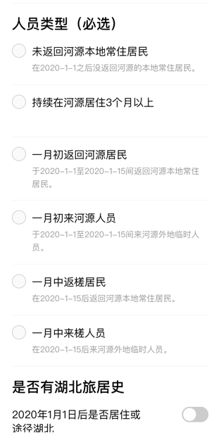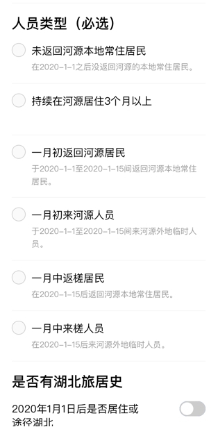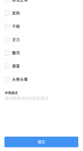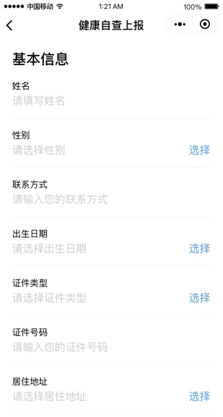 2、錄入基本信息(姓名、性別、聯系方式、出生日期、證件類型、證件號碼、居住地址、詳細地址)、選擇人員類型、是否有湖北旅居史(若有則需填寫湖北居住或途徑城市)、選擇是否有如下癥狀、詳細描述,點擊“提交”按鈕即可提交成功。