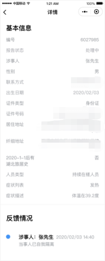 2、錄入反映人信息(姓名、聯系手機)、涉事人信息(姓名、性別、聯系方式、出生日期、證件類型、證件號碼、居住地址、詳細地址)、選擇人員類型、是否有湖北旅居史(若有則需填寫湖北居住或途徑城市)、選擇是否有如下癥狀、詳細描述,點擊“提交”按鈕即可提交成功。