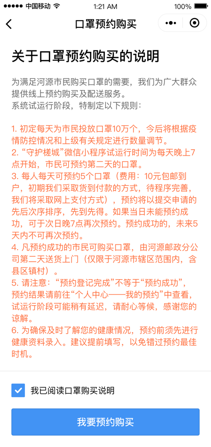 1.每人每天可預約5個口罩,10元包郵到戶(含口罩費用和物流費用)。初期我們采取貨到付款的方式(由河源郵政分公司物流職員代收);待程序完善后,我們將采取網上支付方式。