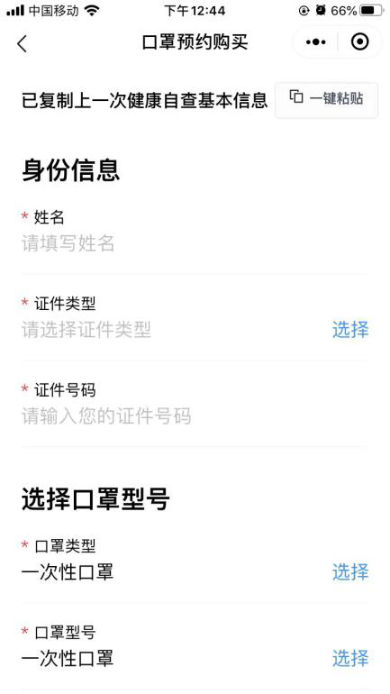 3、選中“我已閱讀口罩購買說明”,點擊“我要預約購買”按鈕,進入【預約登記頁】(如已填寫“健康自查上報”,點擊“一鍵粘貼”可直接獲取個人信息)