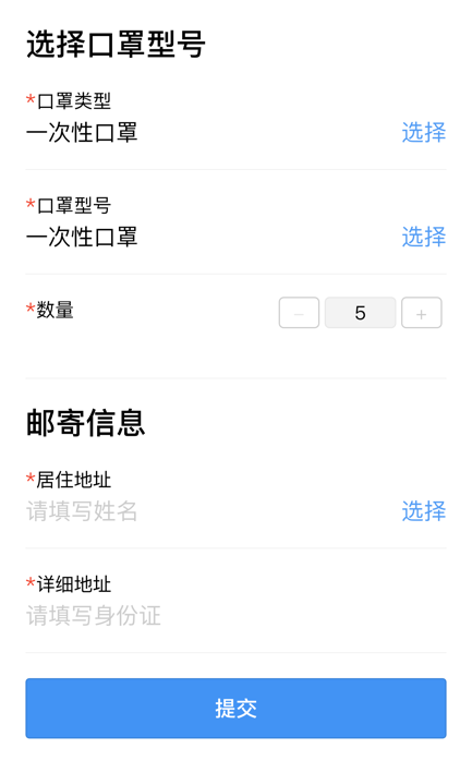 4、如未填寫“健康自查上報”材料,無法獲取個人信息,需錄入姓名、身份證號,選擇居住所在地并填寫收件詳細地址,點擊“提交”按鈕,即可成功進入排隊(若當天口罩數未被預約完)。