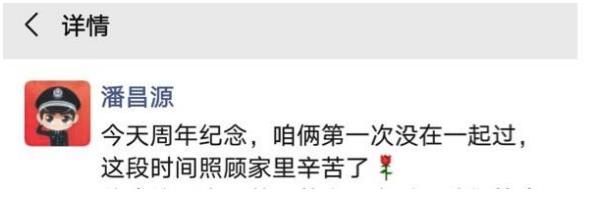 ——2月3日潘昌源朋友圈:今天周年紀念,咱倆第一次沒在一起過,這段時間照顧家里辛苦了