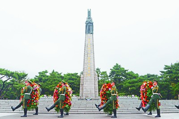 武警遼寧總隊沈陽支隊官兵來到抗美援朝烈士陵園,敬獻花籃,緬懷先烈。鄒新江 攝
