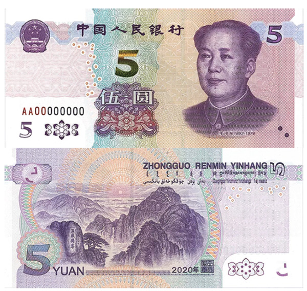 新版5元紙幣背面左上角和右下角局部圖案調整為凹印對印面額數字與凹印對印圖案,調整主景、面額數字的樣式,票面年號改為“2020年”。