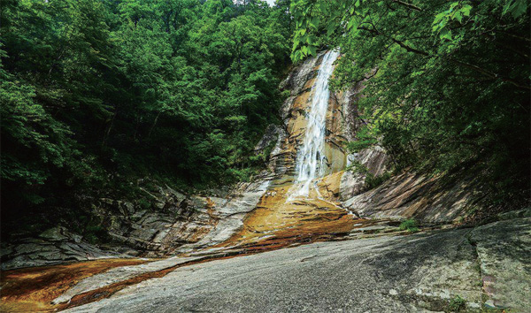 “踏遍黃峨岱與廬,唯有天堂水最佳”。天堂寨的水,經相關部門檢測,為地表一級礦泉水,是世界上難覓的純凈水。由于這里屬于亞熱帶季風氣候,加上降水量多而蒸發量少,所以天堂寨水源特別充沛。山頂有被譽為“瑤池”的天塘;山腰有傾瀉而下的百道飛瀑;山下則流泉縱橫,碧潭遍布。天堂之水潺潺流淌,奔流不息,滋養著“華東最后一片原始森林”。從安徽六安金寨縣天堂寨國家森林公園大門進入,拾級而上,只聞瀑鳴如雷,寒氣逼人,五道清靈圣潔的山水形成的巨大水簾,依次出現在我們面前,飛瀑爭奇斗艷,源遠流長,據說即使三伏天百日大旱,也從未斷流過。