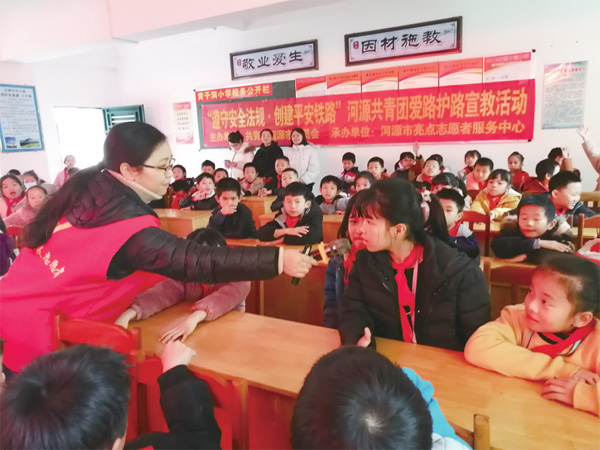 近日,團(tuán)市委組織青年志愿者在源城區(qū)黃子洞學(xué)校開展“遵守安全法規(guī)·創(chuàng)建平安鐵路”河源市共青團(tuán)愛路護(hù)路宣傳教育活動(dòng);顒(dòng)現(xiàn)場,青年志愿者通過懸掛橫幅、案例講解、鐵路知識(shí)問答和觀看宣傳小視頻等形式,向?qū)W生講解有關(guān)鐵路護(hù)路知識(shí),同時(shí)號(hào)召學(xué)生抵制影響和危害鐵路運(yùn)輸安全的行為,爭做一名愛路、護(hù)路的小衛(wèi)士。