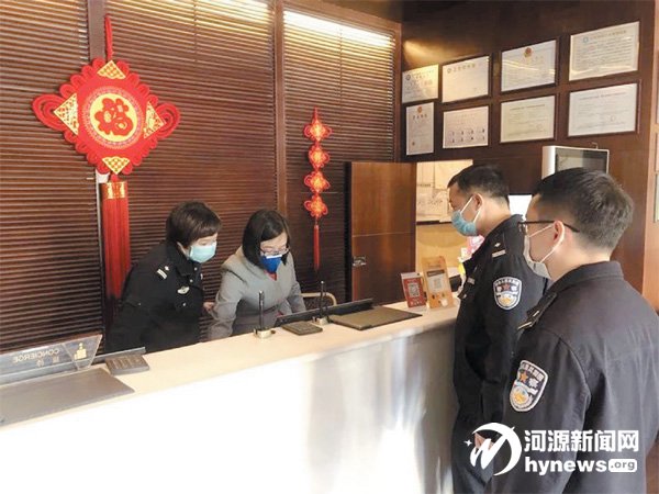廖瑾(左一)在旅業(yè)檢查入住人員登記信息。