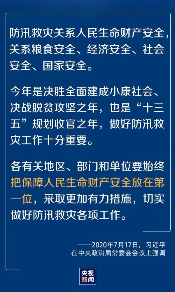黨中央高度重視今年的防汛救災工作,5月19日,習近平在主持中央政治局常委會會議研究有關工作時,要求有關方面高度重視今年汛期長江中下游汛情,壓實防汛工作責任,克服疫情影響,搶抓水利工程修復,加強物資儲備,組織開展搶險培訓和演習,全力保障人民生命財產安全。