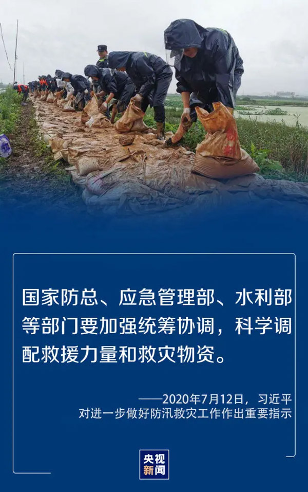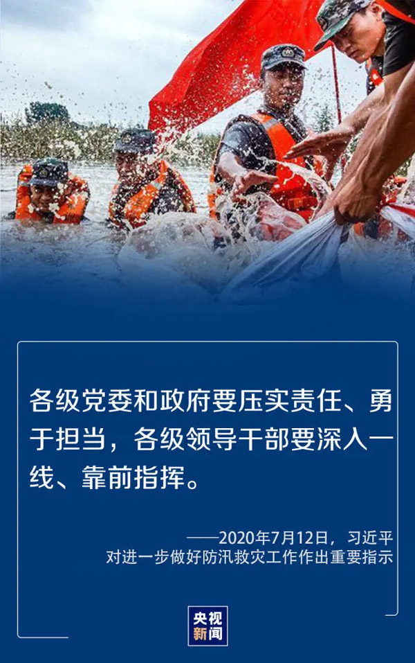 7月12日,習近平對進一步做好防汛救災工作作出重要指示指出,各級黨委和政府要壓實責任、勇于擔當,各級領導干部要深入一線、靠前指揮,組織廣大干部群眾,采取更加有力有效的措施,切實做好監測預警、堤庫排查、應急處置、受災群眾安置等各項工作,全力搶險救援,盡最大努力保障人民群眾生命財產安全。