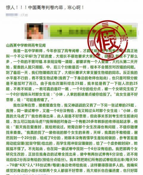 記者搜索發現,有多家媒體曾對此文辟謠。在2012年,中國青年報曾辟謠,“高考閱卷師冒死揭露內幕”系舊謠新炒。當時,還有網友在這篇不實文章的開頭加了地名,標題被改為“北京高考閱卷師冒死揭露內幕:學生的前途就這樣被耽誤”。新聞晚報在2013年的一篇報道中也提到,早在2007年、2008年左右,這篇網文就在網上熱轉過,有網友提到文章里面的“每天50-70袋試卷”的情況,不是2013年前后的閱卷場景。