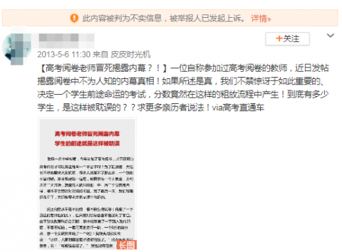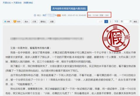 某知名論壇上曾出現了一篇“高考閱卷老師冒死揭露內幕,學生前途就是這樣被耽誤”的帖子。發帖人聲稱曾參與過某省高考閱卷工作,閱卷教師只為趕進度,或者不管對錯亂批閱,或者“一分鐘批作文”,“草菅人命”。此帖涉及高考內容,吸引眼球,迅速成為熱點,在各大論壇轉載。部分網友大呼“難怪自己當年高考分數低于預期值,原來就是這樣被坑的”。教育部門和公安機關迅速落地查人,據發帖人交代,發帖只是為了好玩,想吸引網民關注,提高知名度而已,自己也沒有參與過高考閱卷工作,有的是聽傳言,自己做了演繹。這位發帖人認識到事情的嚴重性,自行刪除了內容并向社會道歉。