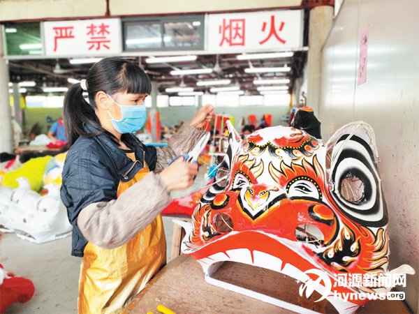 2018年12月,在深圳福田區區委黨校、區司法局的幫扶下,總投資1500萬元的福樓醒獅文化傳播股份有限公司在林寨鎮樓鎮村成立,如今已發展成為帶領全村脫貧致富的“核心引擎”,全村包括61戶貧困戶在內的671戶家庭入股該公司。如今,村里可以說是每家每戶都在做醒獅,一半以上的留守村民已經掌握了制作工藝。“如果熟練的、勤快的,每月可以做到五六千元。”福樓醒獅文化公司負責人陳金明說,當天,該公司有3個扶貧車間實現開工,其他扶貧車間還在緊張準備中。他說,去年年底已早早接滿了今年訂單,如今全公司正開足馬力盡快完成。去年一年銷售1.5萬件,人手顯得有點緊張。他說,如果條件可以,他愿意響應市政府的號召接納更多的貧困戶實現就業。