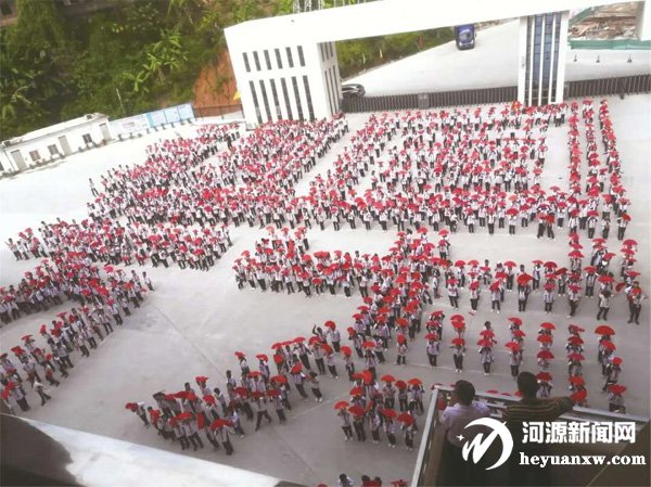 昨日,龍川第一實驗學校的學生在校園里舉著紅扇子,排成“祖國萬歲”四字方陣,還有學生手舉紅旗,排成“心”形,齊唱《歌唱祖國》。嘹亮的歌聲和現場的震撼場面,給學生們上了一堂生動的愛國主義教育課。