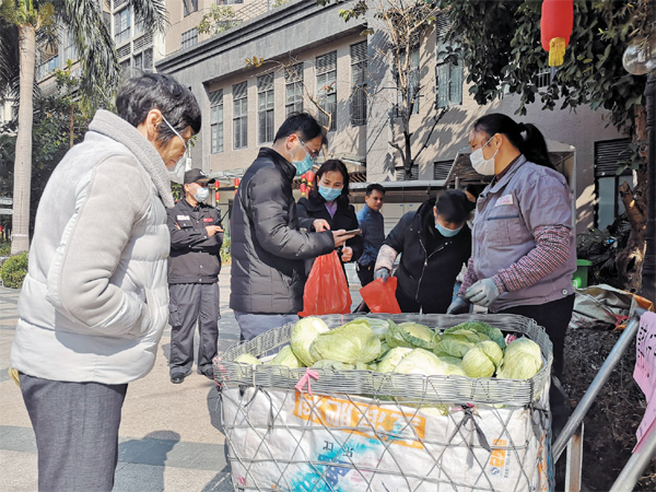 看到物業在賣菜,剛下樓的老大爺黃增麟立刻挑了兩個包菜,讓物業幫忙稱了帶回家。黃大爺告訴記者,由于疫情嚴重,自己好幾天沒有出過家門口,趁著陽光好,樓下沒什么人,所以出來逛兩圈。“青菜雖然不算多,但是價格實惠,在疫情面前,家門口也能買到菜,真是太好了!”