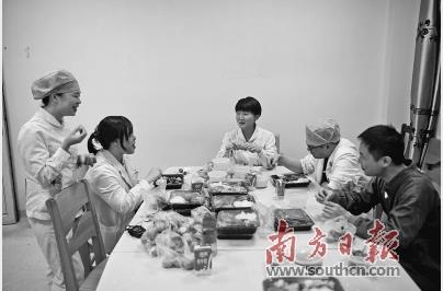 廣州市第八人民醫(yī)院急診科護(hù)士劉煥儀與同事一起吃值班年夜飯。南方日?qǐng)?bào)記者 張梓望 徐昊 攝