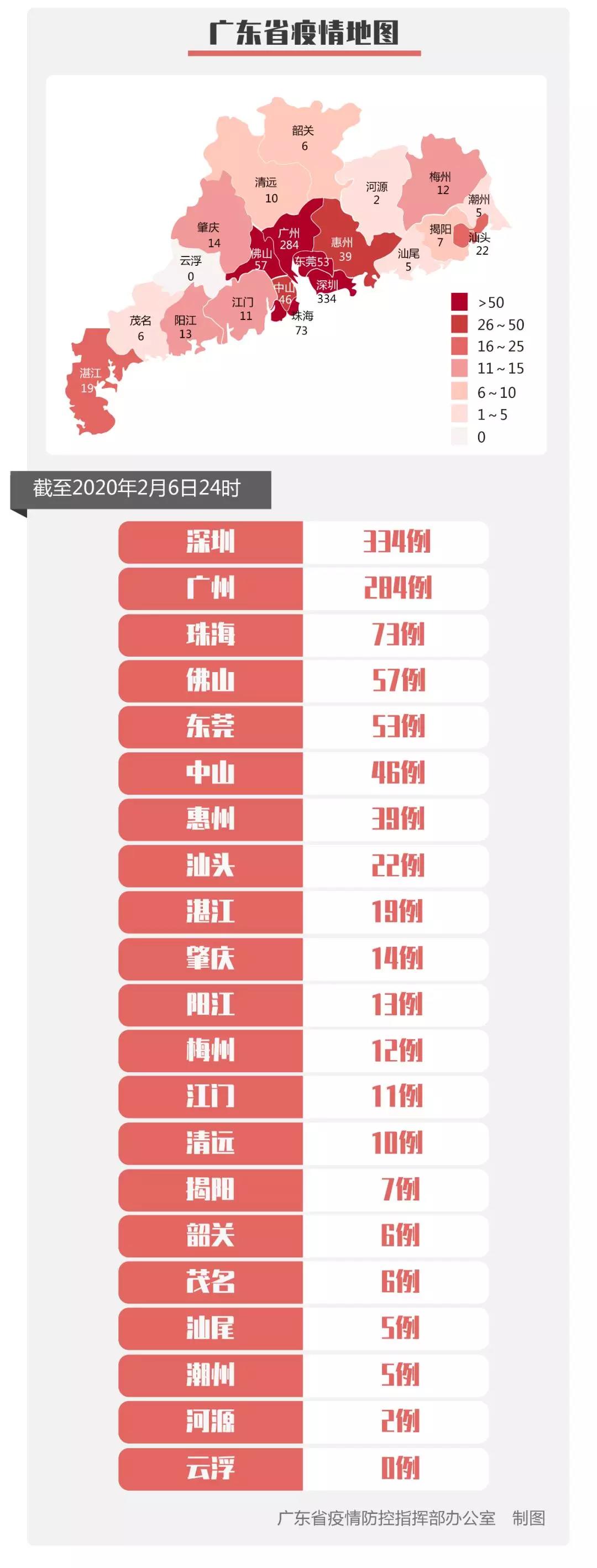 截至2月6日24時,全省累計報告新型冠狀病毒感染的肺炎確診病例1018例。6日當天全省新增確診病例74例。新增確診病例中,廣州市29例、深圳市20例、佛山市7例、東莞市6例、惠州市4例、中山市2例、汕頭市2例、江門市2例、肇慶市1例、河源市1例。新增死亡病例1例,為肇慶市1例。另有疑似病例170例。有3522名密切接觸者正在接受醫學觀察。