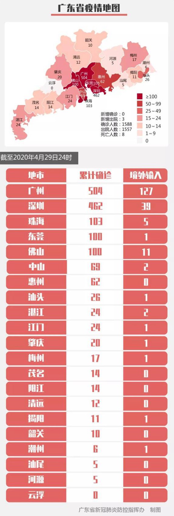 截至29日24時,全省累計報告新冠肺炎確診病例1588例,其中境外輸入病例193例。累計出院1557例,累計死亡8例。