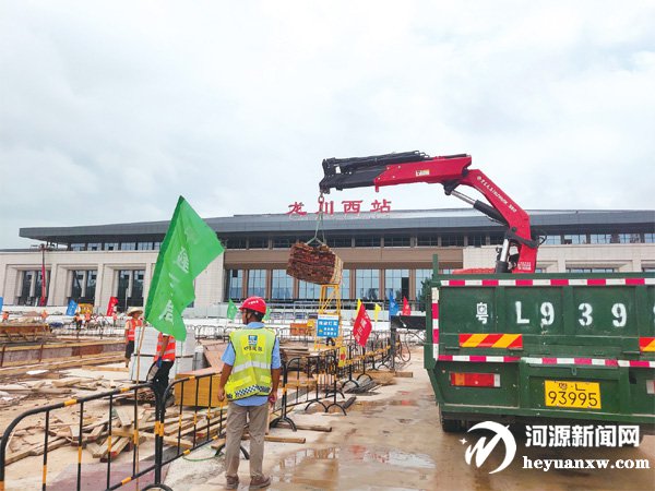 龍川西站站前廣場,工人在進行鋪磚工作。