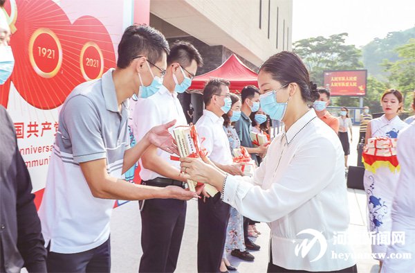 啟動儀式上,市委常委、宣傳部部長朱蔚蔚等共同倒流沙點亮啟動臺,正式啟動2021南國書香節(jié)河源分會場活動。朱蔚蔚向市文聯(lián)、市圖書館、源城區(qū)源西街道康樂路南社區(qū)、源城區(qū)東埔街道東升路社區(qū)、河源市第二中學(以下簡稱市二中)、河源市第三小學、廣東堅基集團、美的置業(yè)河源城市公司等單位、社區(qū)、學校、企業(yè)代表贈送《論中國共產(chǎn)黨歷史》《中國共產(chǎn)黨簡史》等書籍。