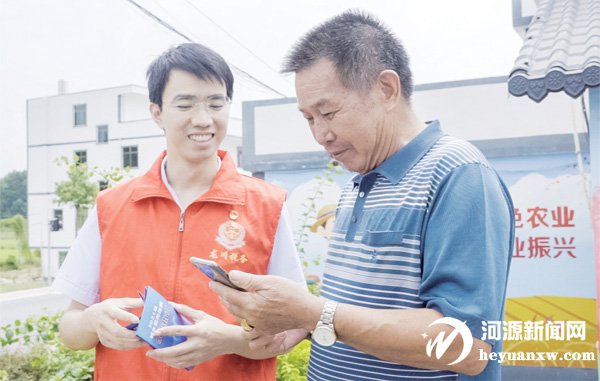 稅務志愿者在輔導村民使用手機繳交城鄉居民基本醫療保險。