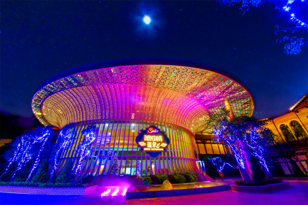 燈光霓虹閃爍迷離,62個溫泉池霧氣氤氳